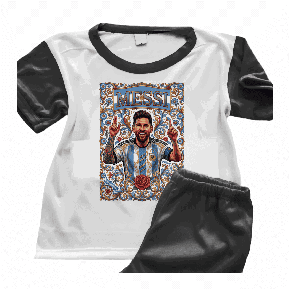 El diseño Messi Festejando en Fileteado Porteño aporta un toque divertido y moderno, ideal para fanáticos que quieren destacarse con una prenda original para usar o para regalar.