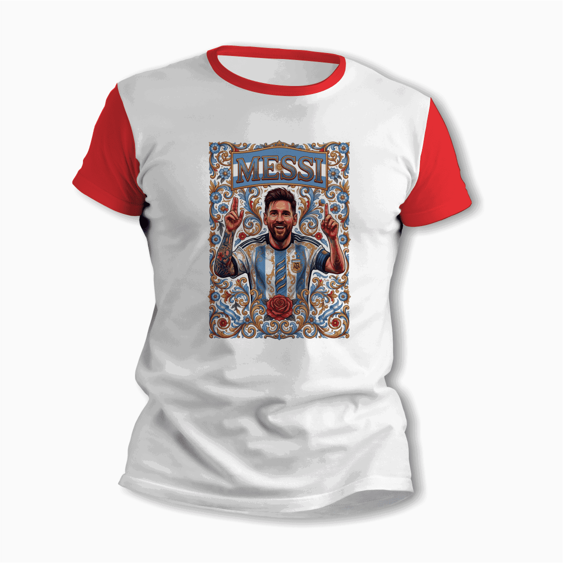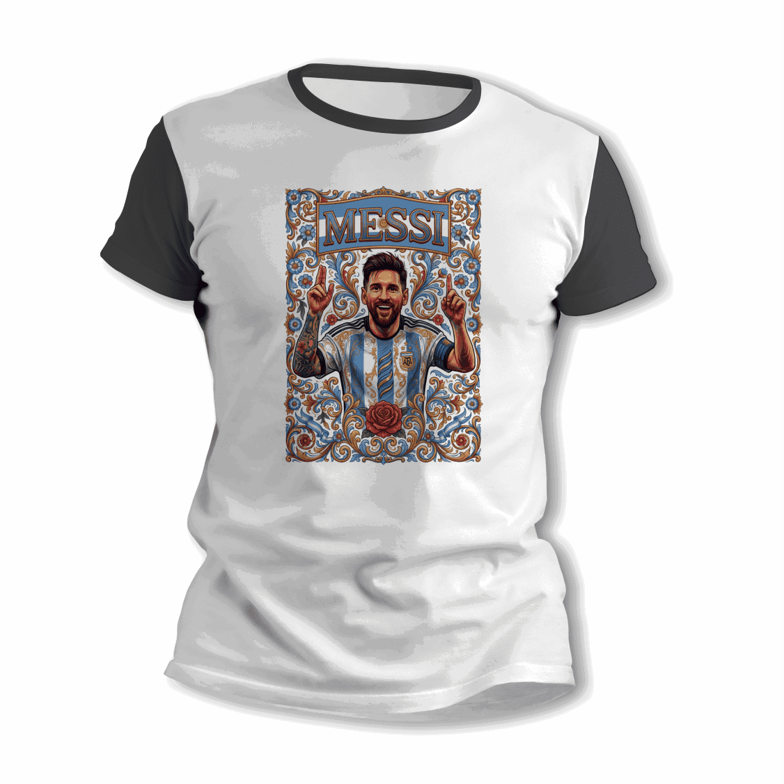 El diseño Messi Festejando en Fileteado Porteño aporta un toque divertido y moderno, ideal para fanáticos que quieren destacarse con una prenda original para usar o para regalar.